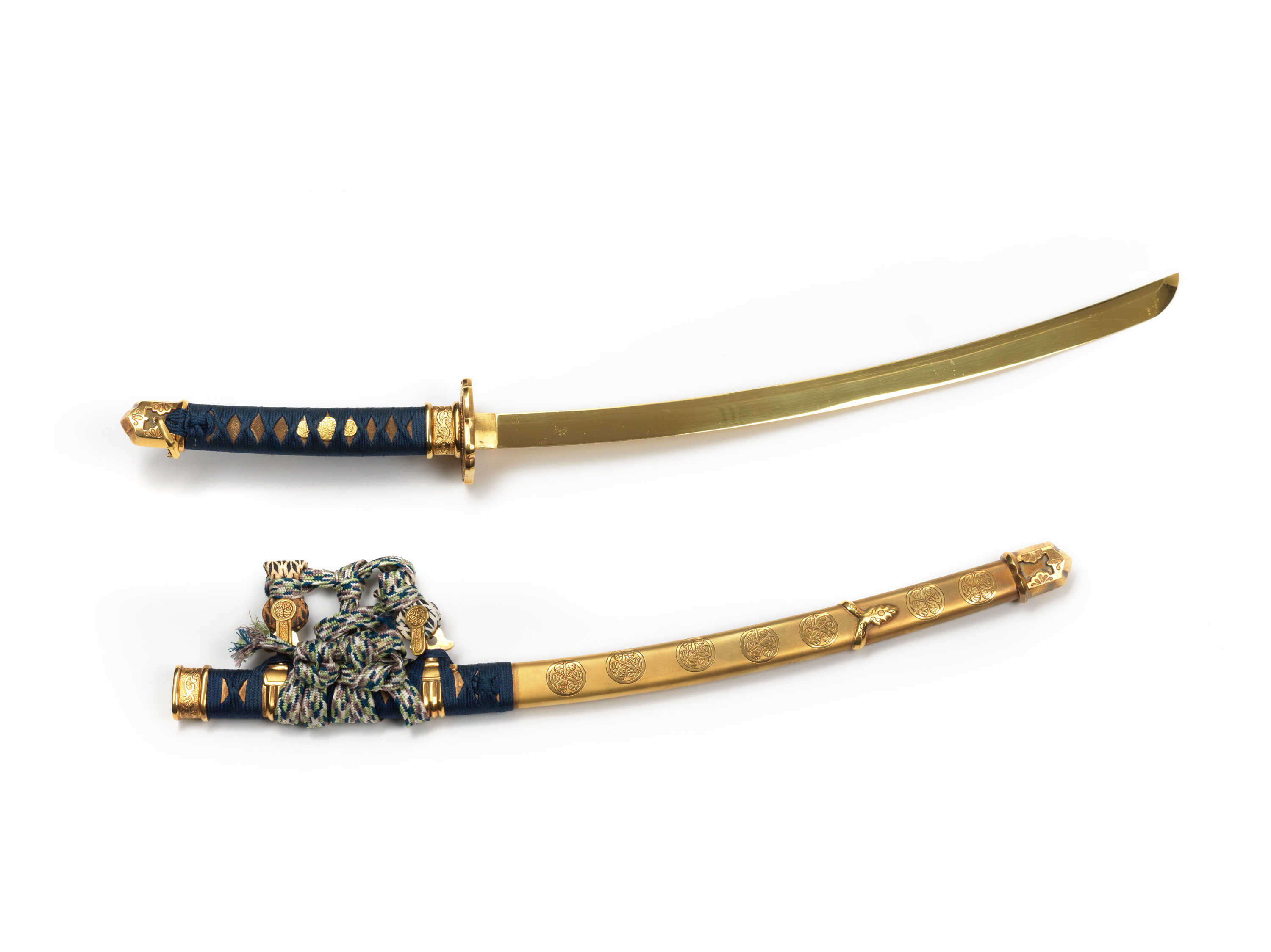 The sword’s mounting is exceptionally detailed, featuring gold ornaments and family crests, a blue silk tsuka-ito, and a distinctive gold menuki and habaki. The blade itself is also fashioned from solid gold.