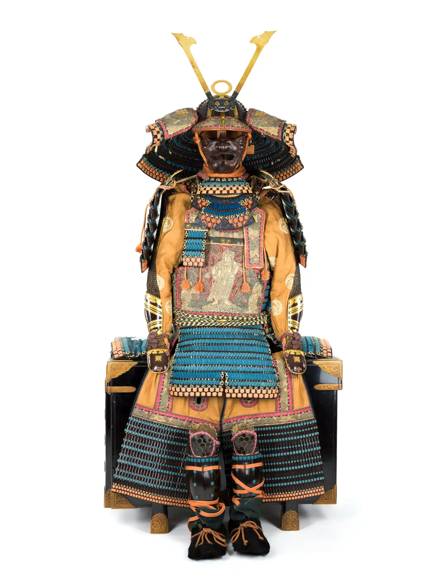 The sode (shoulder guards) are black-lacquered honkozane ōsode, functioning as both protective elements and visual indicators of the wearer’s standing.