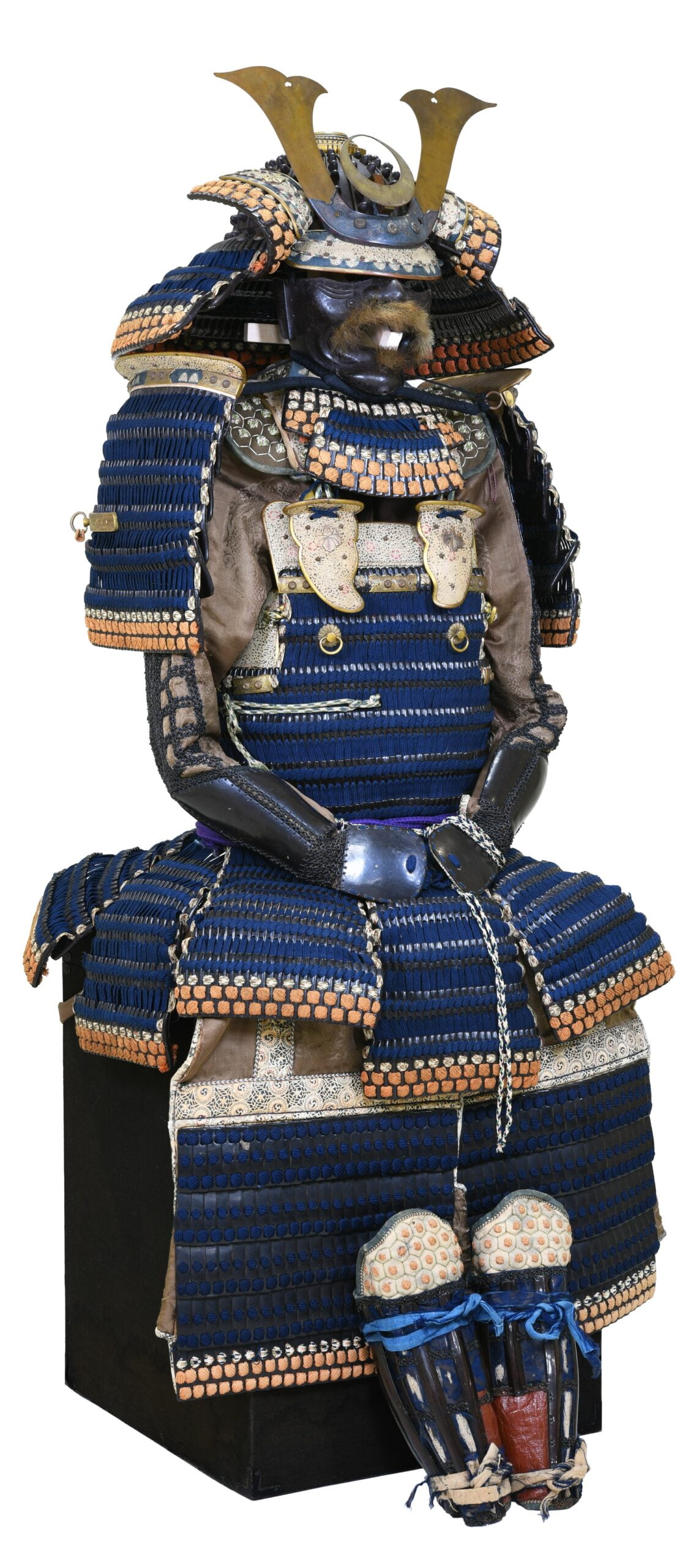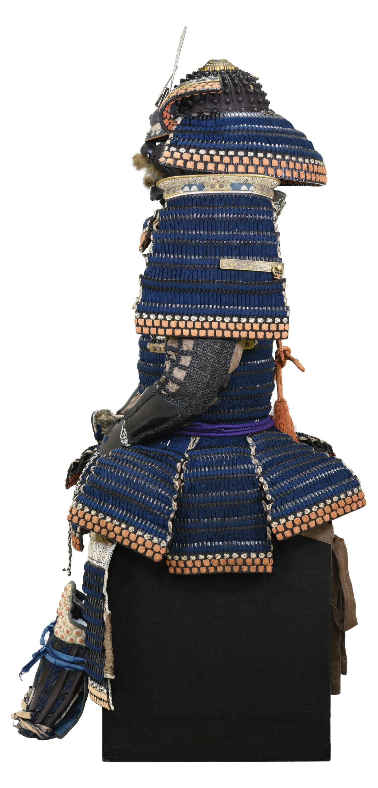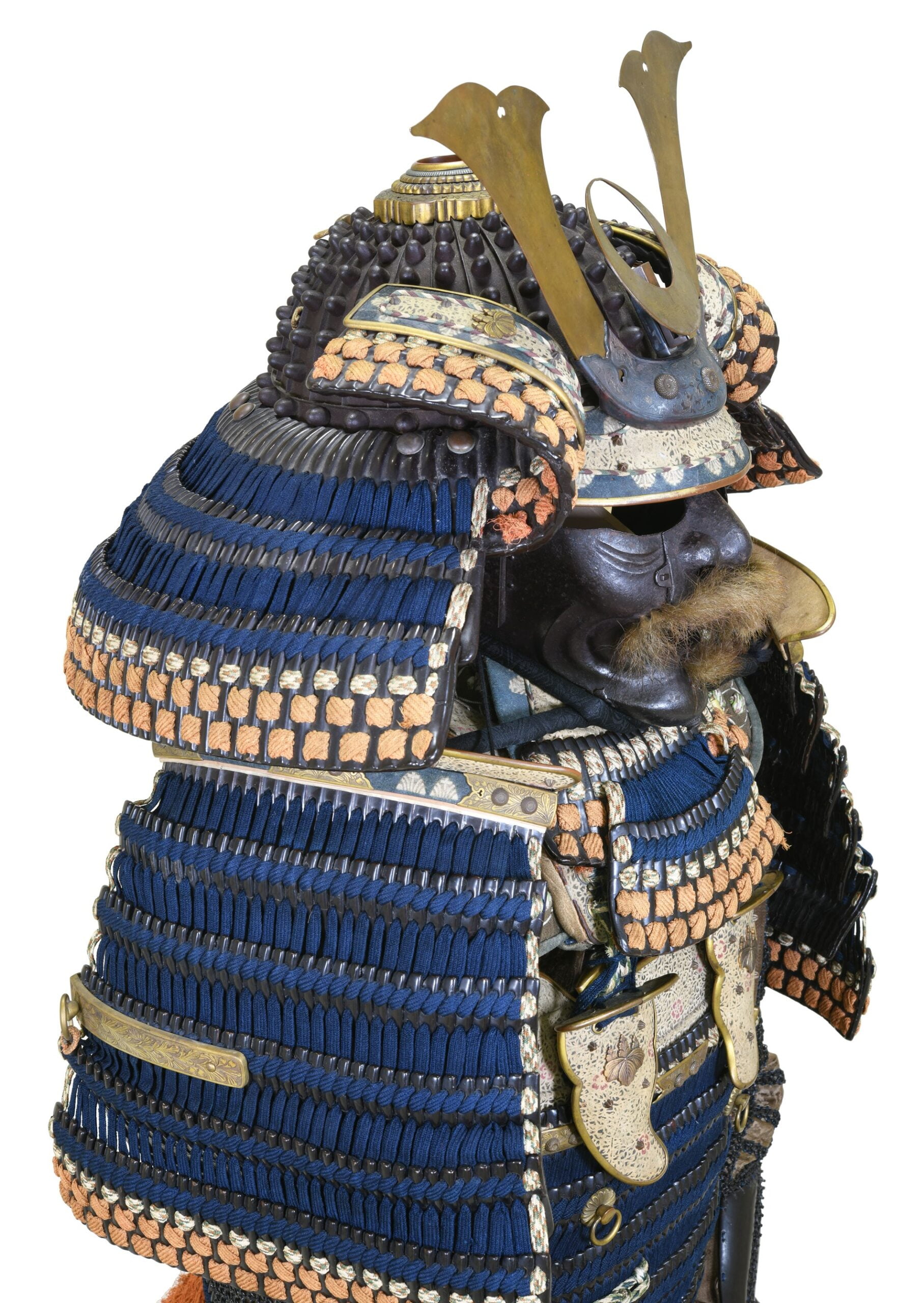 The samurai armor described is an exquisite example Japanese craftsmanship from the Edo period featuring a 24-plate hoshi bachi kabuto (“star bowl,”alluding to the protruding rivets) of rounded form, with elaborate gilt and copper hachimanza (decorative fixture at the central aperture), with two kuwagata stylized antlers and a maedate showing a cut-out moon (mamukitsuki mon). A three-tiered shikoro with kebiki lacing in dark blue and two prominent fukigaeshi adorned with the imperial kiri-mon crest,.