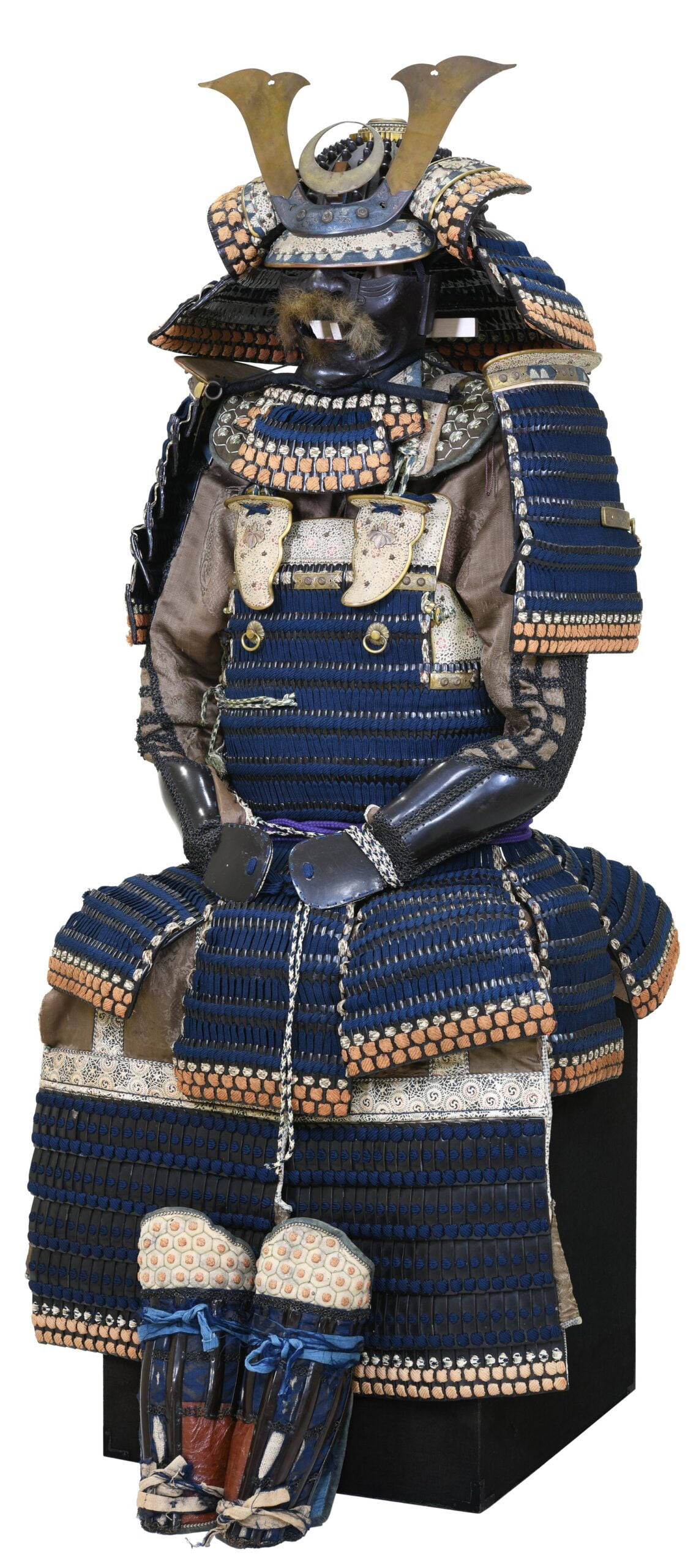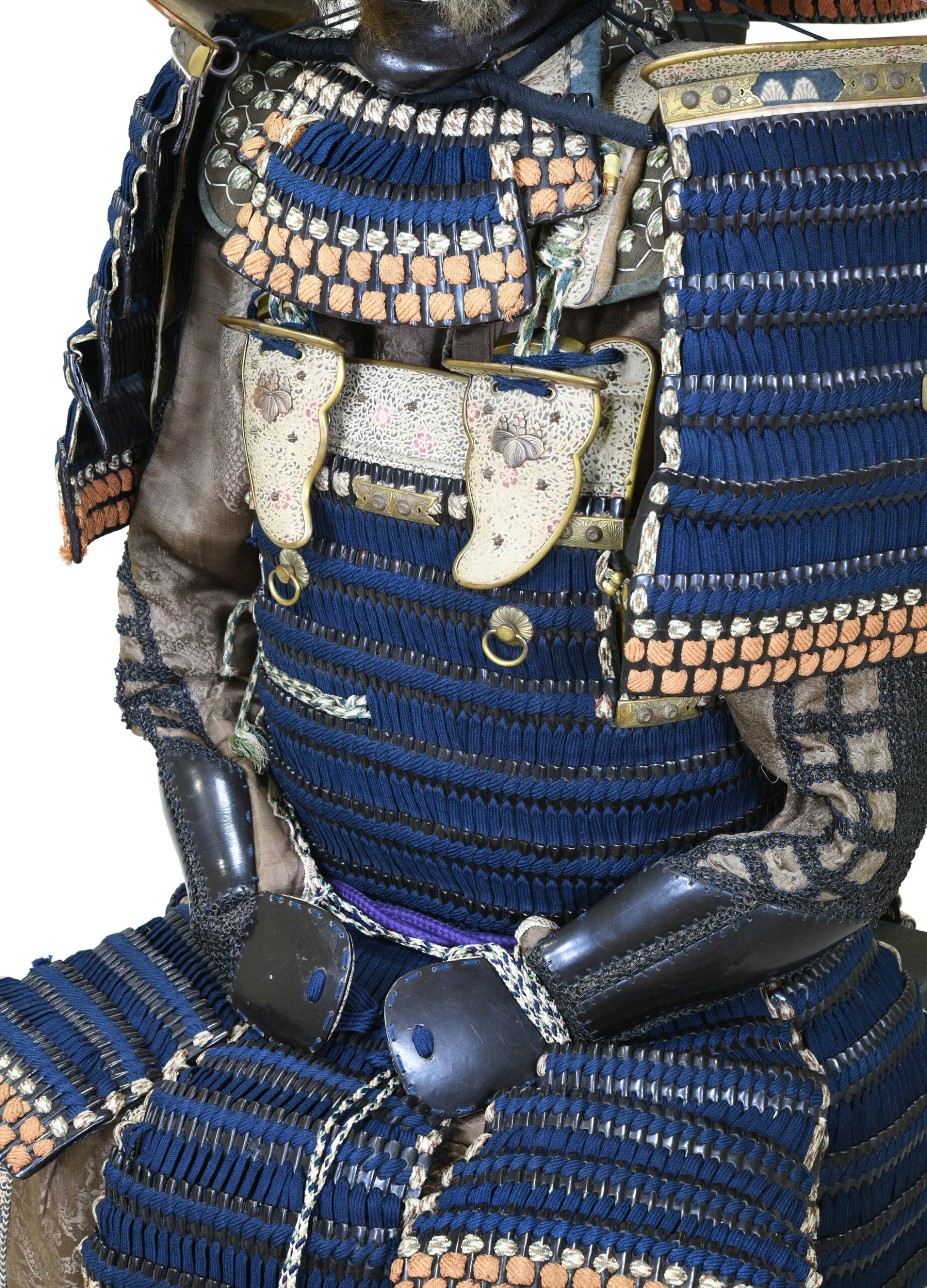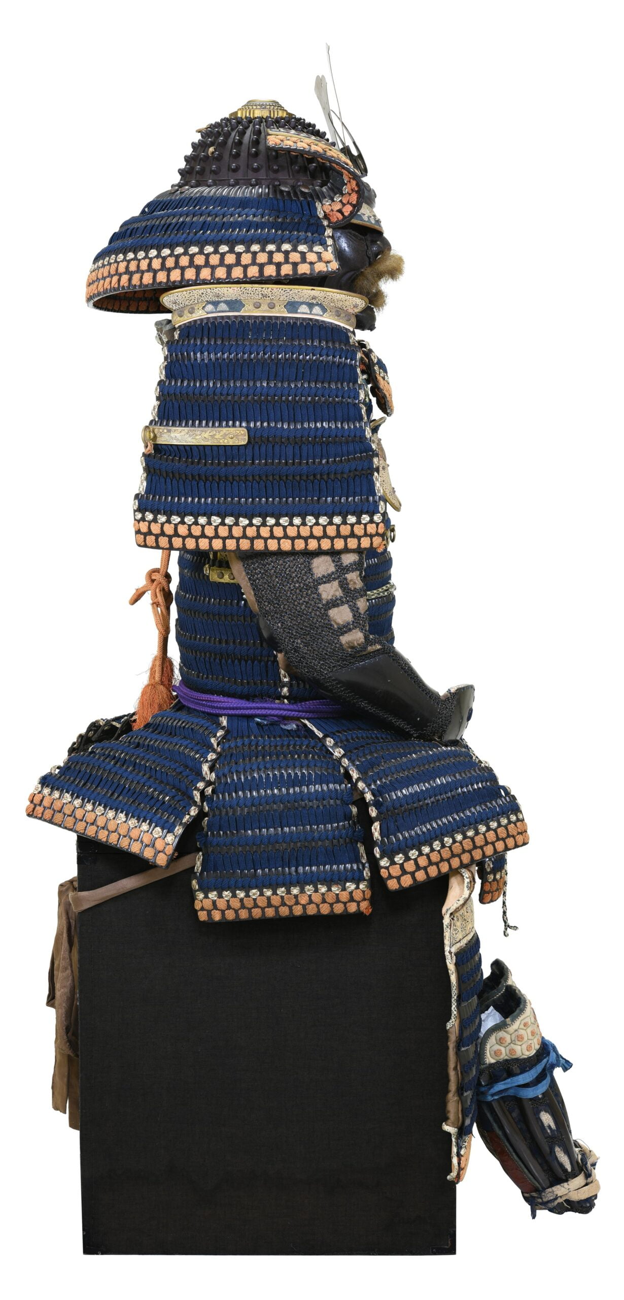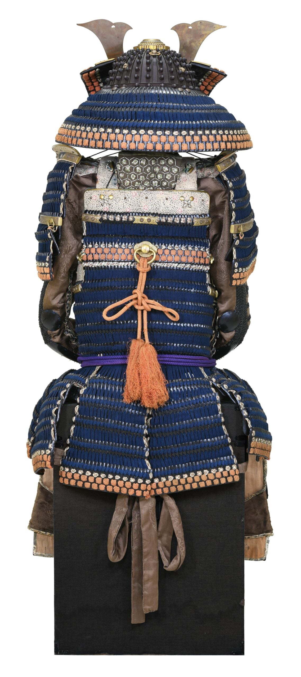 The samurai armor described is an exquisite example Japanese craftsmanship from the Edo period featuring a 24-plate hoshi bachi kabuto (“star bowl,”alluding to the protruding rivets) of rounded form, with elaborate gilt and copper hachimanza (decorative fixture at the central aperture), with two kuwagata stylized antlers and a maedate showing a cut-out moon (mamukitsuki mon). A three-tiered shikoro with kebiki lacing in dark blue and two prominent fukigaeshi adorned with the imperial kiri-mon crest,.
