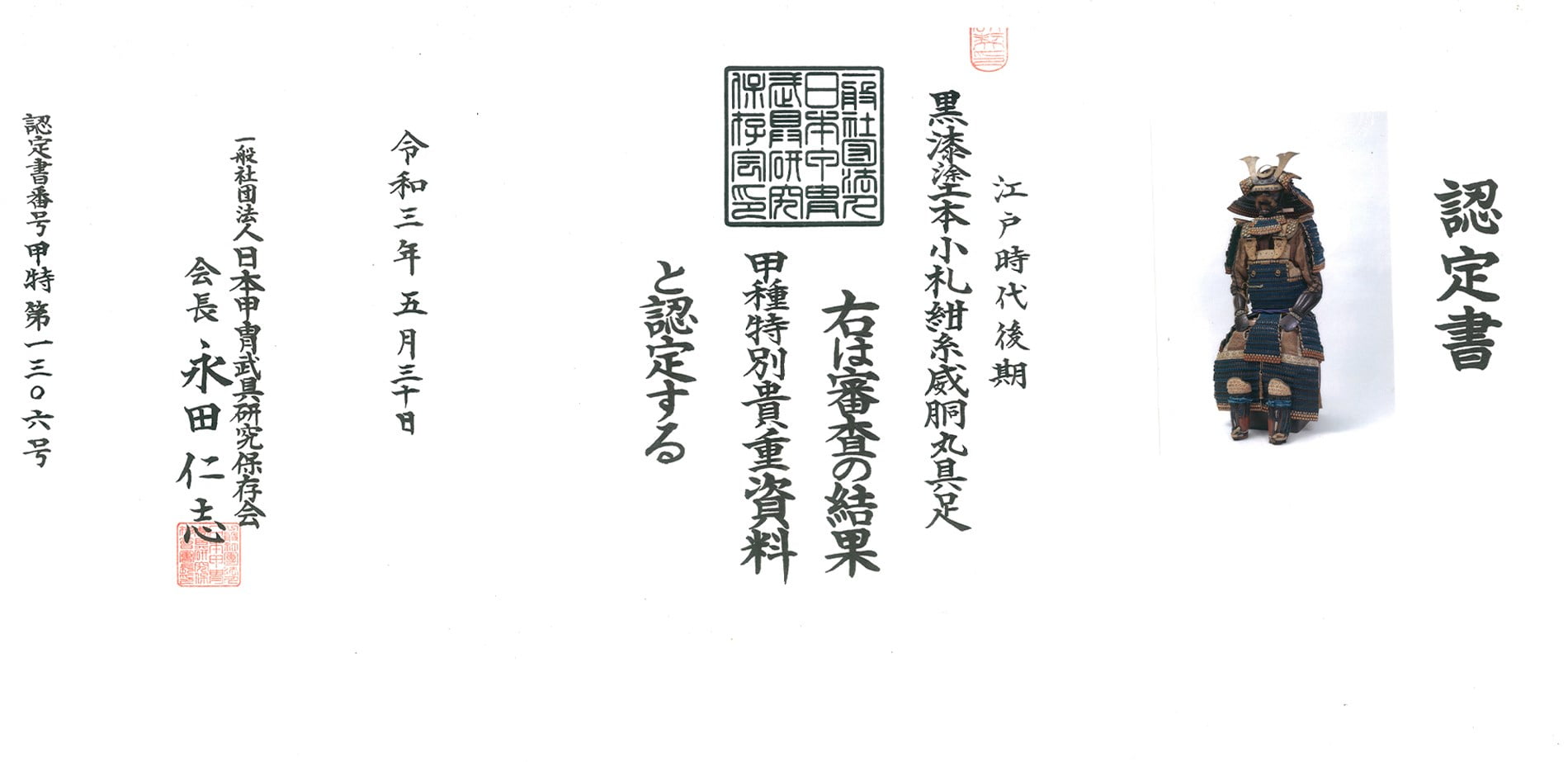 This suit of armor is accompanied by a Koshu Tokubetsu Kicho Shiryo Paper, the second-highest certificate issued by The Association for the Research and Preservation of Japanese Helmets and Armor. As per the certificate, the armor dates back to the late Edo period.